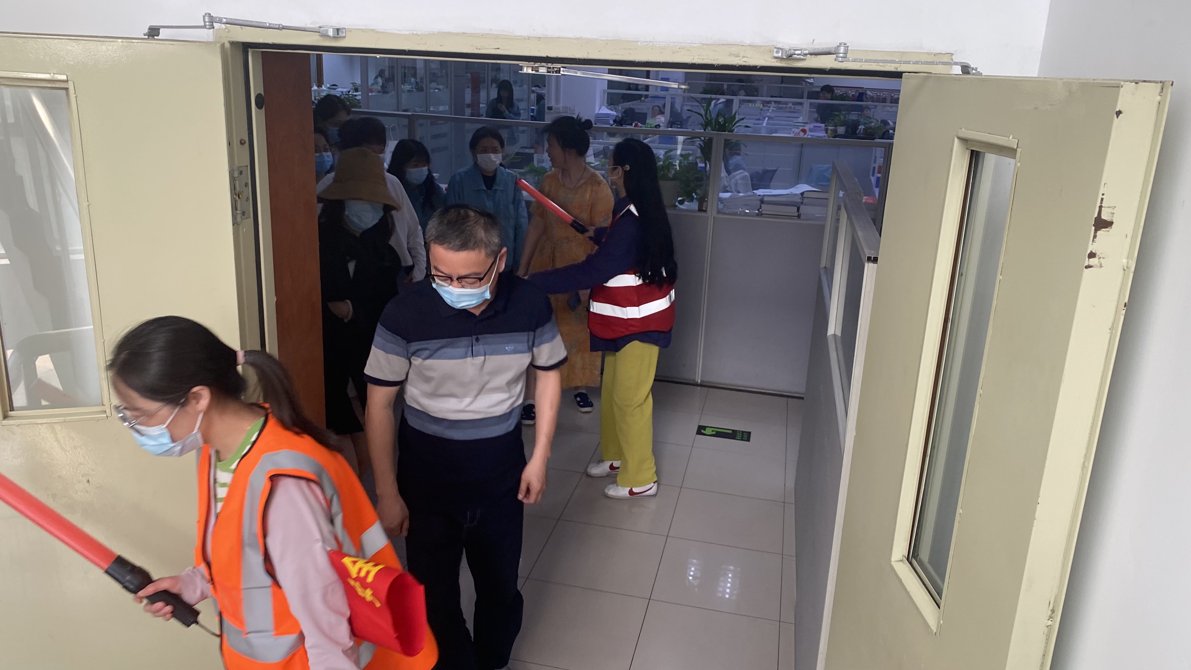 消防中控室收到现场手报报警信号,公司安委会办公室主任、行政总监戴锦文宣布演练开始并通过消防广播提醒现场员工有序应急疏散。