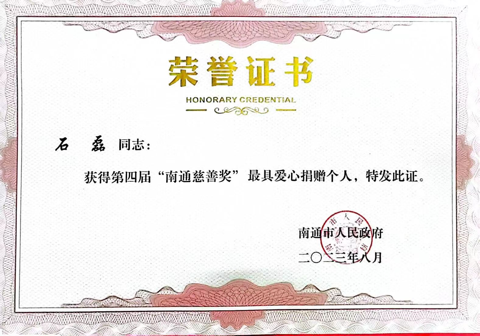 太阳集团0638登录网站荣获“南通市最具爱心捐赠企业”荣誉称号,总裁石磊荣获“最具爱心捐赠个人”荣誉称号。