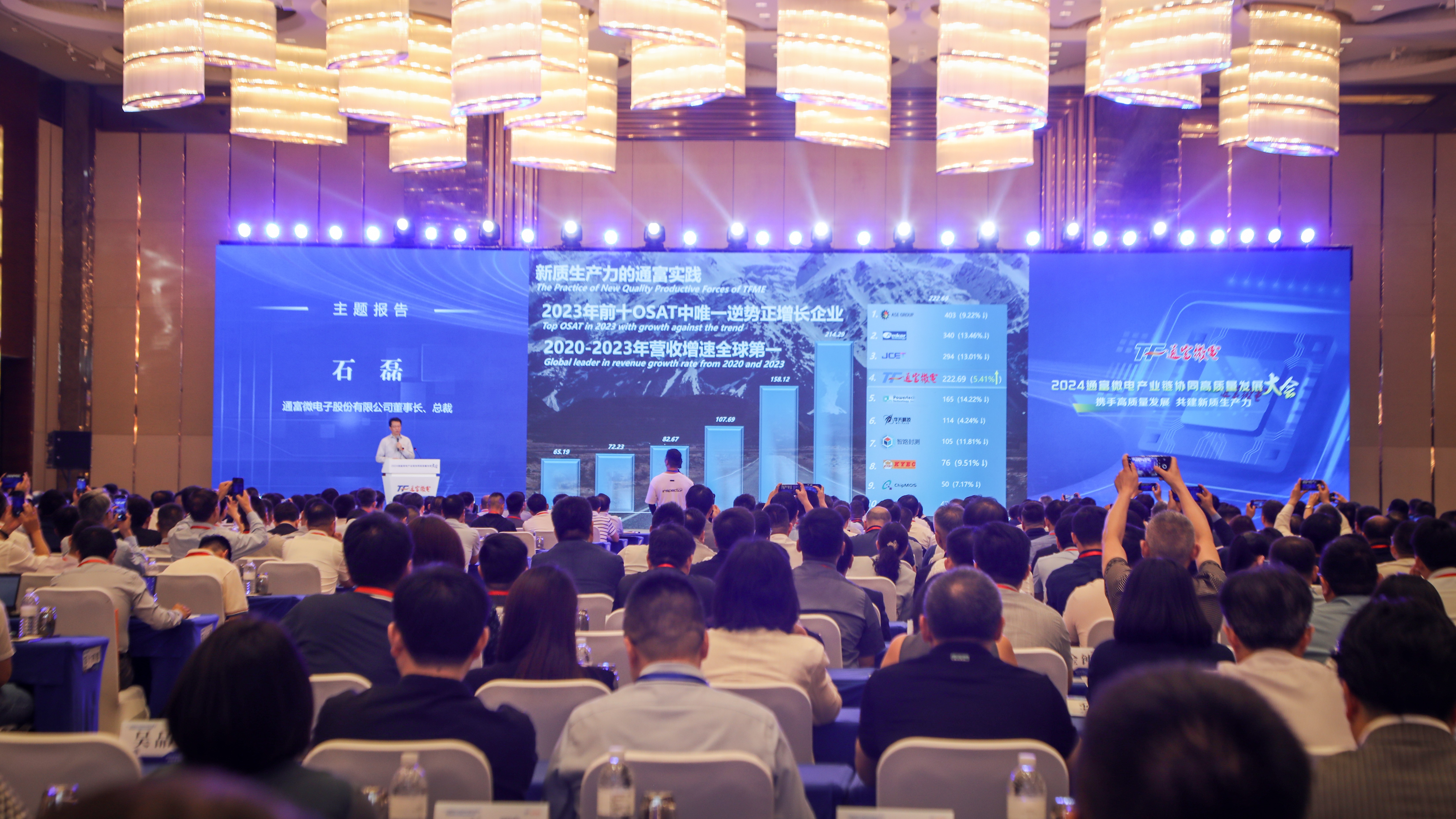 大会上,石磊董事长作“携手高质量发展 共建新质生产力”的主题报告。报告中,董事长从2024年宏观经济形势,半导体行业趋势,总书记重要讲话精神,新质生产力的通富实践,感恩石明达名誉董事长,高质量发展的通富理念、道路和优势,供应链合作关系,打造通富产业联盟等方面阐述了通富发展方向、发展目标,加快建设新质生产力,不断强化高水平合作,一起推进中国式现代化通富新实践,共同参与全球美丽世界的构建。